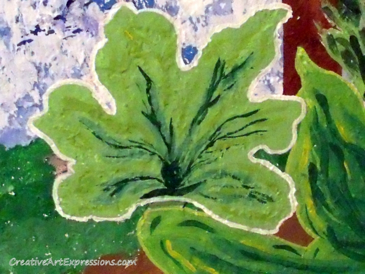 Large green plant upper left, green background plants, medium size green leaf next to waterfall added. 1-31-13