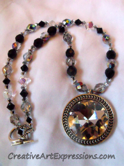 Creative Art Expressions Handmade Black & Crystal Necklace Jewelry Design would make a great gift for any lady who loves bling! Necklaces I've made with this pendant have been my best sellers! You can't go wrong with black and crystal! It is 16 3/4 inches long. This necklace is made with:*Metal Gallery Large Faceted Crystal Pendant*Jet black, 4mm Xilion bicone Swarovski crystals*Crystal comet argent light, 4mm Xilion bicone Swarovski Crystals*Czech fire-polished glass, vitrail, 8mm faceted round beads*Jet black, 6mm Xilion bicone Swarovski Crystals* Czech pressed glass, crystal AB, 8.5x6.5mm dice. *Czech fire-polished glass, jet black, 8mm faceted round beads.It is strung on nylon coated stainless steel bring 19 strand bead stringing wire. The necklace is closed off with an antique silver plated pewter double sided fancy round toggle clasp.Thank you for looking. Find necklaces for sale here: http://www.creativeartexpressions.com/catalog/necklaces