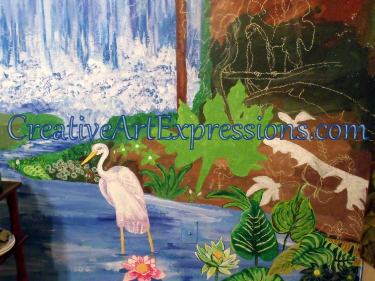 Creative Art Expressions Hand Painted Rainforest Mural in Progress. Chalk drawings in the background for the beginning of more to be painted.When I am doing a wall mural, I draw pieces of it with chalk first, then fill it in with white paint before painting with color. Since I already did the background, the white paint covers the part of the background I'm covering so it won't bleed through the paint.