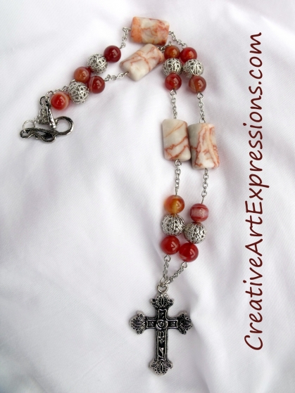 Creative Art Expressions Handmade Red Agate & Marble Prayer Beads Necklace Jewelry Design is 18 inches long. It is made with: