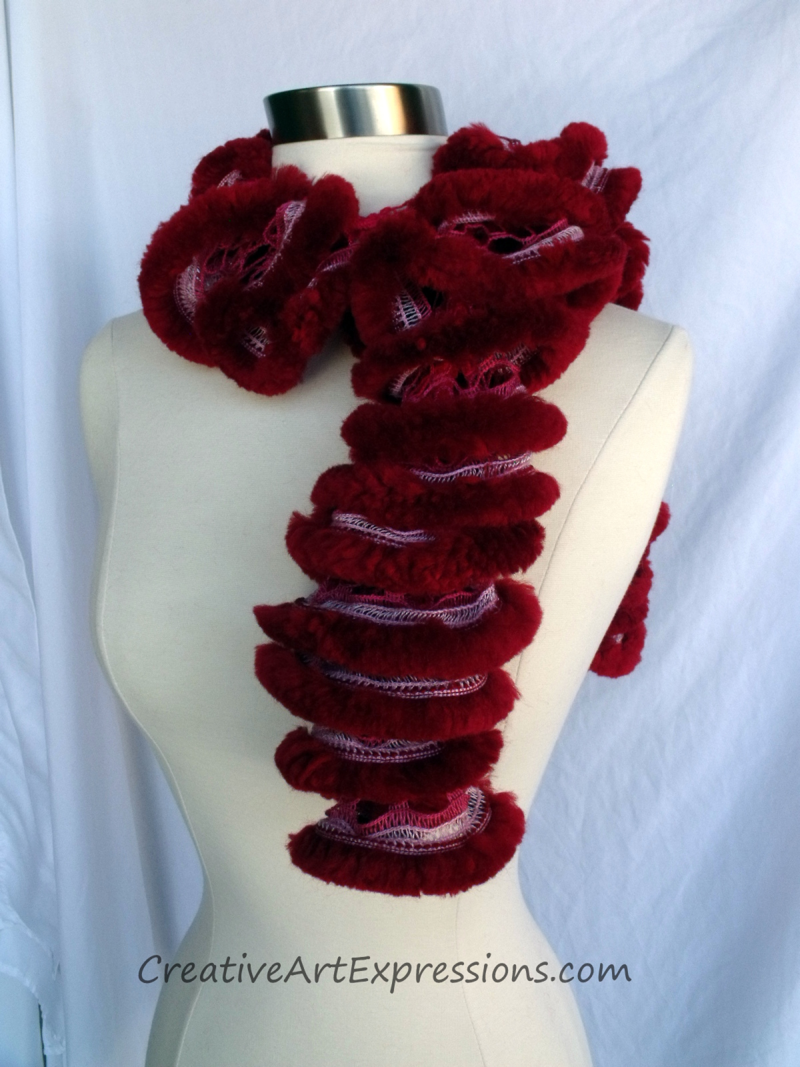 Creative Art Expressions Hand Knit Furry Red Ruffle Scarf is a perfect Christmas scarf! It is 44 inches long and made with 100% acrylic yarn. You can twist it and wear it as an infinity scarf. Hand wash, lay flat to dry.