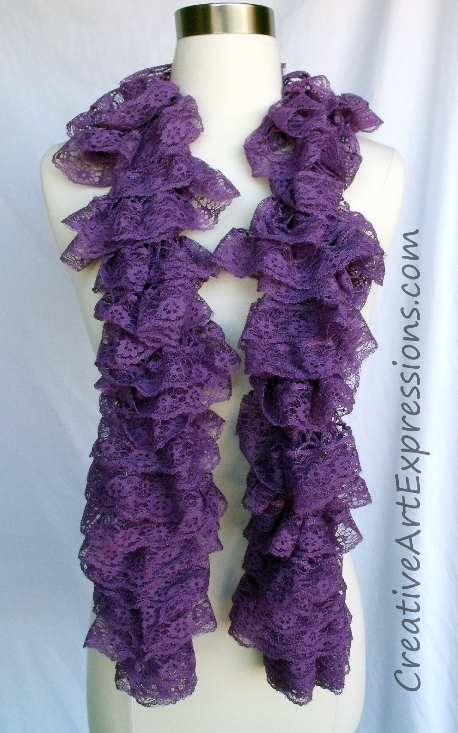 Creative Art Expressions Hand Knit Purple Lace Ruffle Scarf is about 57 inches long and made with purple 55% acrylic 45% nylon yarn. This feminine scarf will dress up any outfit.