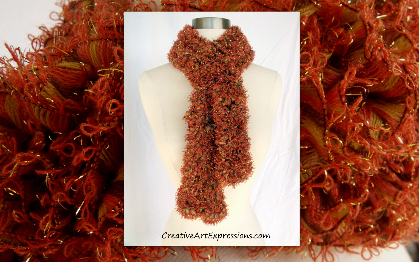 Creative Art Expressions Hand Knitted Autumn Sassy Ruffle Scarf is about 68 inches long and made with 92% acrylic 5% polyester 3% metallic yarn. A perfect scarf for fall.