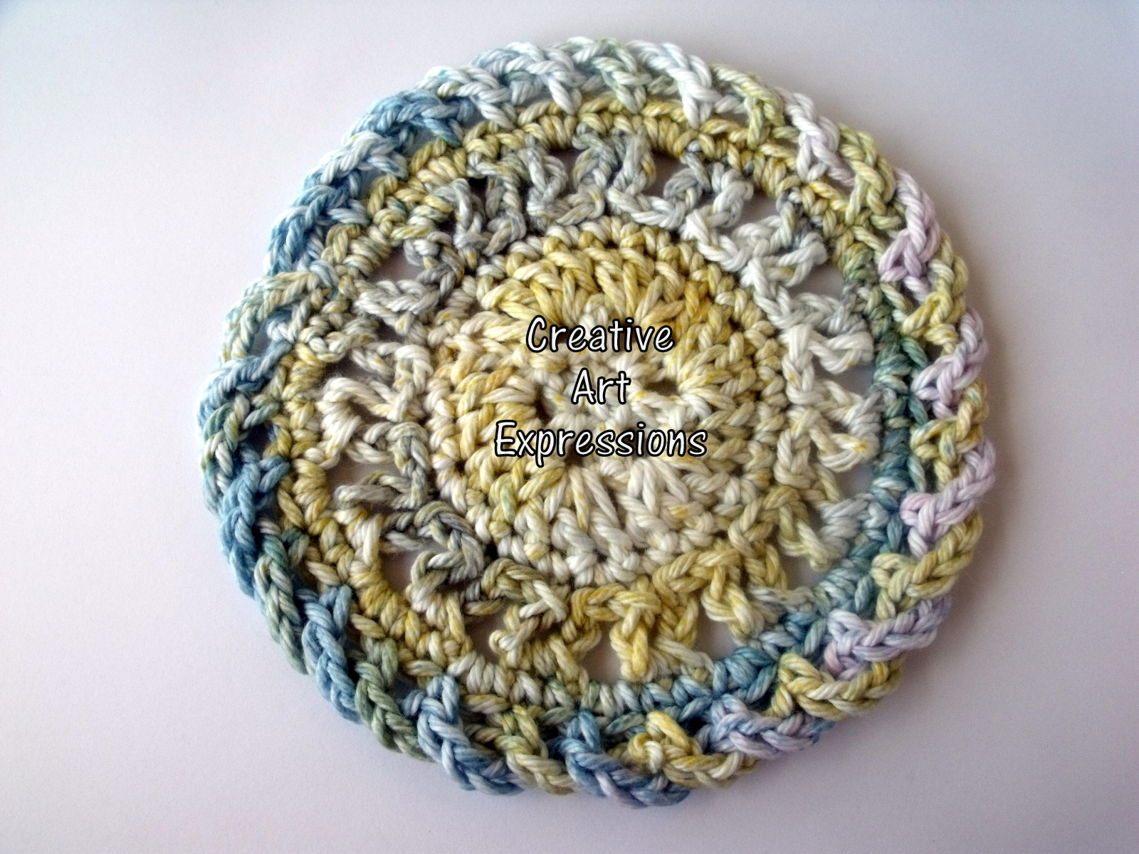 Set of 4 beautiful, pink, blue, yellow & green crocheted coasters are ready to ship! They are 100% cotton & large for a pretty decoration under your fine china or they work for large cups. They are about 5 1/2" in diameter. They are machine washable and dryable. They remind me of a water color painting. What a great addition these would make to your dining table!