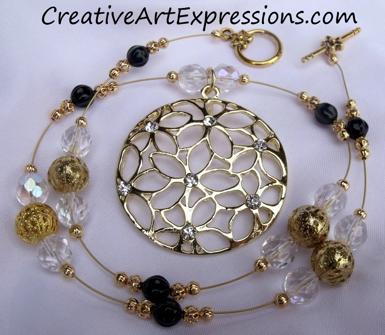 Creative Art Expressions Handmade Gold Black & Crystal Necklace Jewelry Design