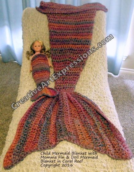Creative Art Expressions Hand Crocheted Child Mermaid Blanket with Mama Fin and Doll Blanket in Coral Reef. Special order yours here: Made To Order Child Mermaid Blanket