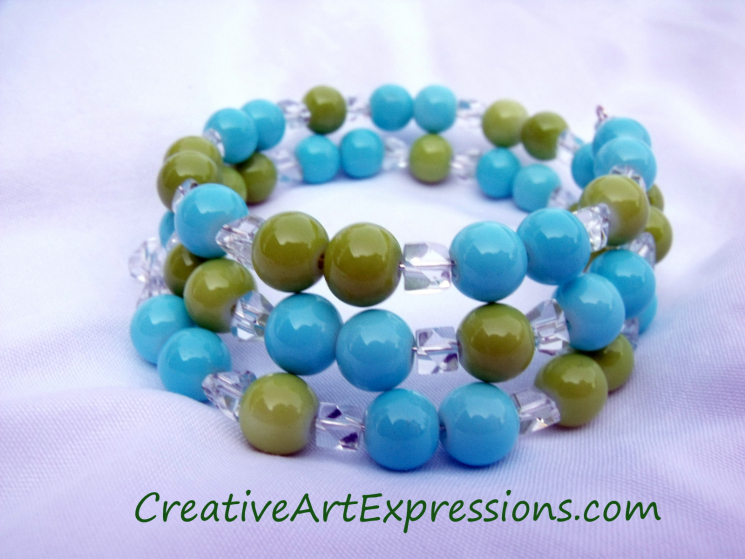 Creative Art Expressions Handmade Blue & Green Neon Bracelet is a memory wire bracelet made with blue and green neon glass beads and clear glass pyramid beads. View bracelets for sale here: Bracelets