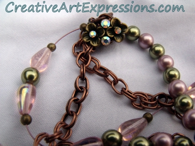 Creative Art Expressions Handmade Pink Green & Copper 3 Strand Flower Necklace Jewelry Design