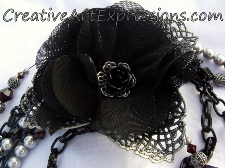 Sold $35.00 Creative Art Expressions Handmade black,silver and garnet 3 Strand flower necklace jewelry design features a black fabric flower on silver filigree pendant about 2 inches x 2 inches. The pendant is attached to the side of the necklace and hides the lobster claw clasp. It is attached to one strand that goes around the back of your neck made with Garnet 4mm & 8mm Swarovski crystals and gunmetal-plated brass, 6mm filigree rounds. This part of the necklace is "floating" which means it shows the black 49 strand beading wire. The beads are held in place with crimp beads.