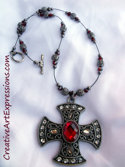 Creative Art Expressions Handmade Black Antique Silver & Red Greek Cross Necklace Jewelry Design features an antique silver metal cross with a red rhinestone center and diamond rhinestone accents. It measures 1 3/4 x 1 3/4 inches. The necklace is 15 3/4 inches long. This unique necklace is perfect for any occasion. It is made with:* Red Faceted Rondelle Glass Beads 3x4mm*Gunmetal-plated brass, 6mm filigree It is closed off with a silver leaf toggle clasp. The necklace is strung on Accu-Flex®, midnight black, 49 strand beading wire. It is a floating or suspended necklace which means the beads are held in place with crimp beads and parts of the wire is exposed as part of the design. Find floating necklaces for sale here: http://www.creativeartexpressions.com/catalog/floating-or-suspended-jewelry