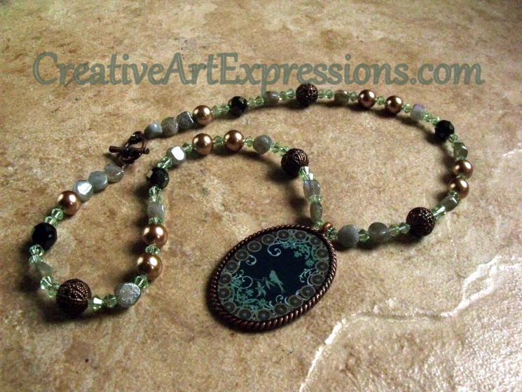 Creative Art Expressions Handmade Antique Bronze & Green Labradorite & Pearl Bird Necklace