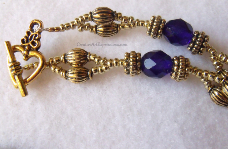 This stunning necklace features a gold metal pendant with blue and 2 green crystals. The necklace is made with gold glass size 10 seed beads, antique gold corrugated rounds and rondelles, and 8mm cobalt blue firepolished glass faceted beads. It is closed off with a ZincRich™ antiqued gold-plated "pewter," double-sided heart toggle clasp. View necklaces for sale here: http://www.creativeartexpressions.com/catalog/necklaces