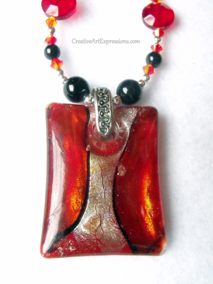 This unique 18 inch necklace made with passionate colors is perfect for your Valentine's Day attire or for that special someone! The focal point of this necklace is a 42x32-43x34 fire red and black lampworked glass curved rectangle with lines and silver-colored foil. The pendant is attached with an antiqued silver-plated pewter ice-pick with a scroll design. The necklace is made with 12mm red glass faceted flat rounds,4mm Swarovski crystal fireopal Xilion bicones, 8mm round black agate beads, and 5mm natural black tourmaline, 3.2mm sterling plated round beads. It is closed off with a ZincRichâ„¢ antiqued silver-plated "pewter" toggle clasp. View other necklaces made with Swarovski crystals and pearls here: http://www.creativeartexpressions.com/catalog/swarovski-crystal-pearl-je...