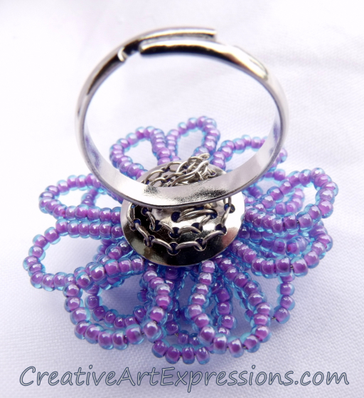 Creative Art Expressions Handmade Purple Aqua Seed Bead Flower Ring Jewelry Design.