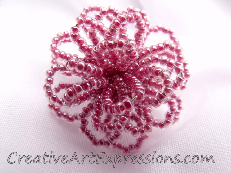 Creative Art Expressions handmade pink seed bead and wire wrapped flower ring jewelry design is made with crystal luster red size 11 Czech glass seed beads. The band is a hypo-allergenic nickel free silver plating ring with 14mm tray. The flower design is 1 1/4 inch x 1 1/4 inch in diameter. The wire used to make the flower is nickel silver dead soft 26 gauge. The ring is adjustable to fit your finger.