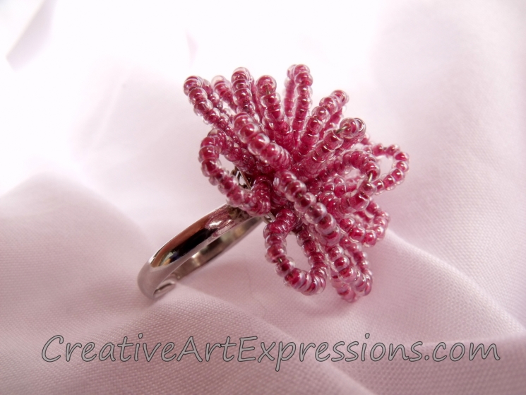 Creative Art Expressions handmade pink seed bead and wire wrapped flower ring jewelry design is made with crystal luster red size 11 Czech glass seed beads. The band is a hypo-allergenic nickel free silver plating ring with 14mm tray. The flower design is 1 1/4 inch x 1 1/4 inch in diameter. The wire used to make the flower is nickel silver dead soft 26 gauge. The ring is adjustable to fit your finger.