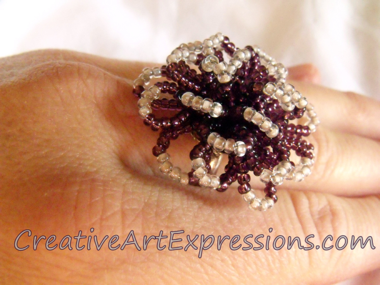 Creative Art Expressions handmade amethyst and crystal brown seed bead and wire wrapped flower ring jewelry design is made with silver lined dark amerthyst and crystal brown size 11 Czech glass seed beads . The band is a hypo-allergenic nickel free silver plating ring with 14mm tray. The flower design is 1 1/4 inch x 1 1/4 inch in diameter. The wire used to make the flower is nickel silver dead soft 26 gauge. The ring is adjustable to fit your finger. See all rings for sale here: http://www.creativeartexpressions.com/catalog/rings