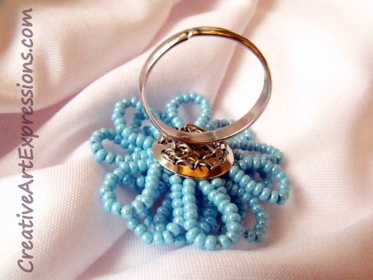 Creative Art Expressions handmade light blue seed bead and wire wrapped flower ring jewelry design is made with light blue luster size 11 Czech glass seed beads . The band is a hypo-allergenic nickel free silver plating ring with 14mm tray. The flower design is 1 1/2 inch x 1 1/2 inch in diameter. The center is a 4mm red faceted glass bead. The wire used to make the flower is nickel silver dead soft 26 gauge. View rings for sale here: http://www.creativeartexpressions.com/catalog/rings