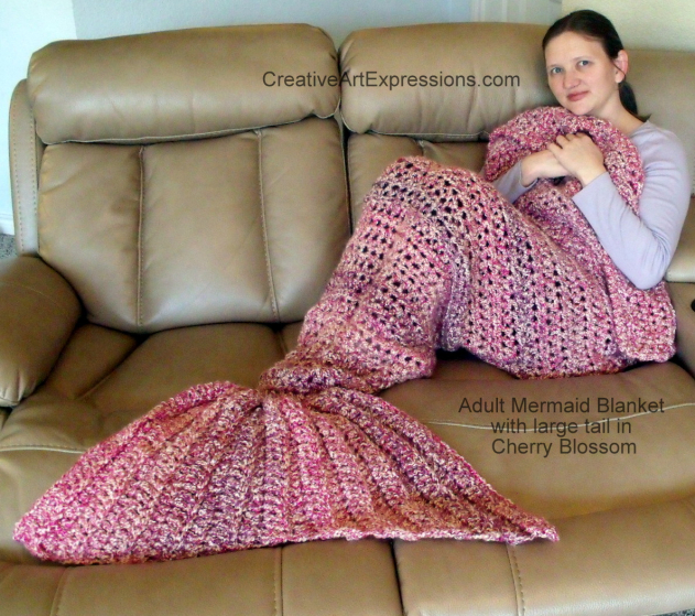 Hand Crocheted Adult/Teen Mermaid Blanket In Cherry Blossom With Large Tail. Special order your adult size mermaid blanket here: Made To Order Adult Mermaid Blanket