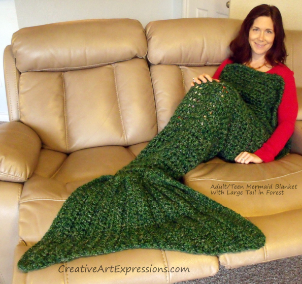 Creative Art Expressions Hand Crocheted Adult/Teen Mermaid Blanket With Large Tail in Forest is made with Lion Brand Homespun Forest Yarn. It is machine washable and dryable. Order your adult/teen mermaid blanket here: Made To Order Adult Mermaid Blanket