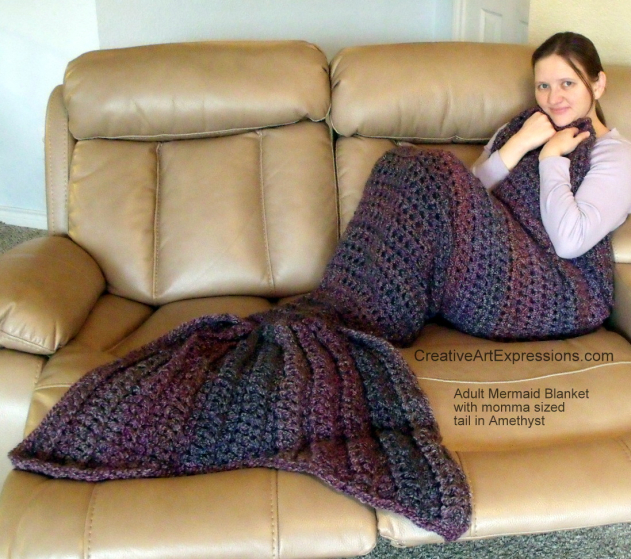 Creative Art Expressions Hand Crocheted Adult Mermaid Blanket With Momma Sized Tail in Amethyst. So far this is one of my favorite colors! Special order your adult or teen mermaid blanket here: Made To Order Adult Mermaid Blanket