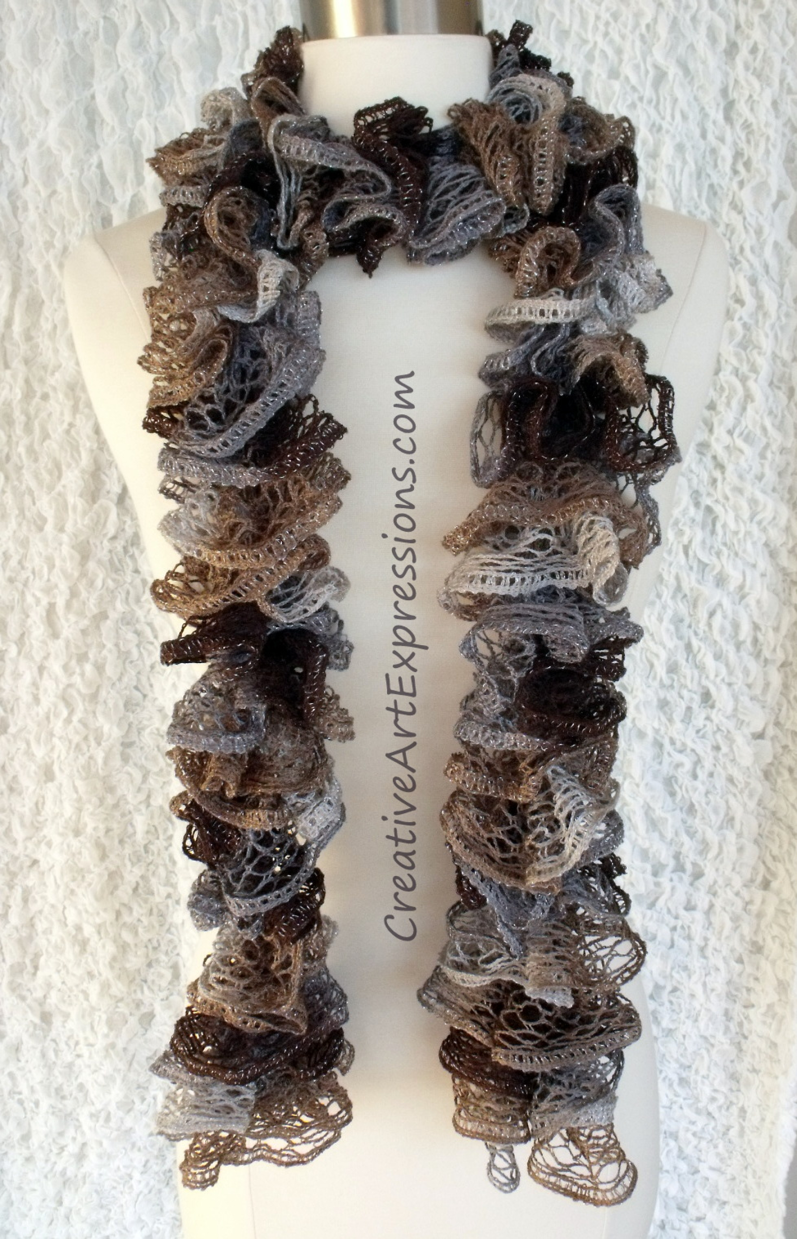 Creative Art Expressions Hand Knitted Waltz Ruffle Scarf is made with gray, brown, light gray, dark brown yarn. The yarn is 92% acrylic and 8% polyester. It is about 71 inches long. This would make a great gift or add it to your own wardrobe.
