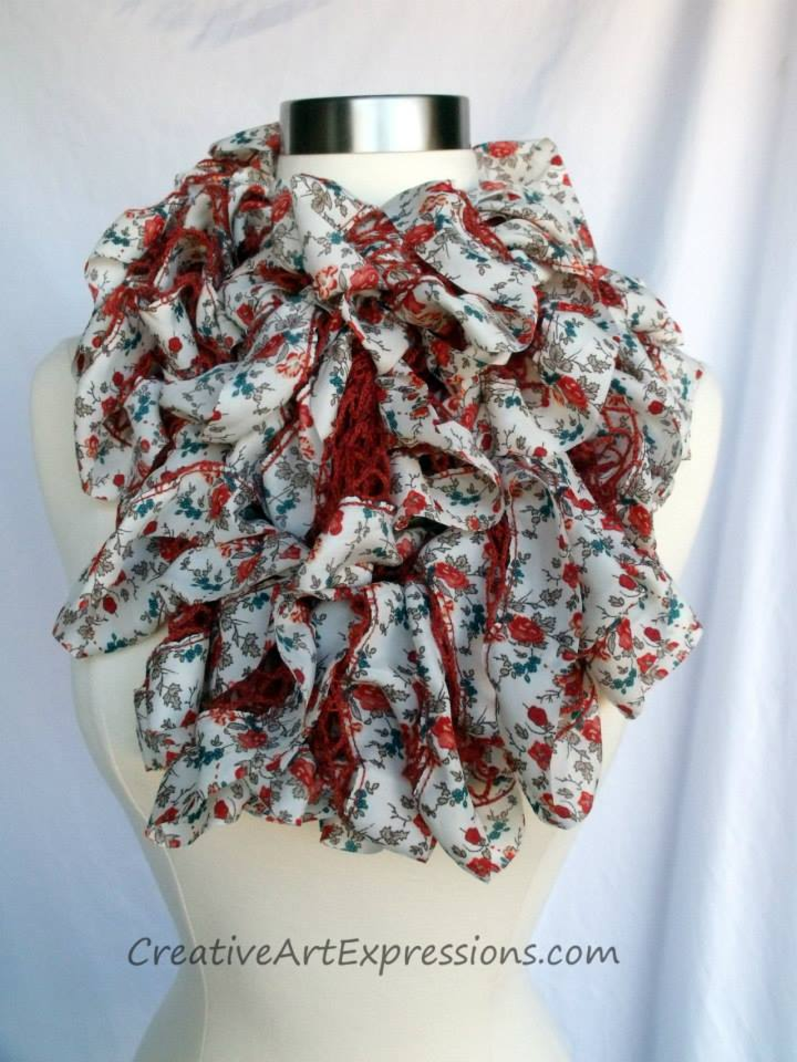 Creative Art Expressions Hand Knitted White Orient Fabric Lined Ruffle Scarf is about 69 inches long. Little blue flowers accent reddish orange roses on the fabric trim. This scarf is made with Starbella 50% acrylic 50% Polyester yarn. The fabric trim is silky smooth. This classy scarf would make a beautiful addition to any wardrobe. This scarf is hand wash and lay flat to dry.